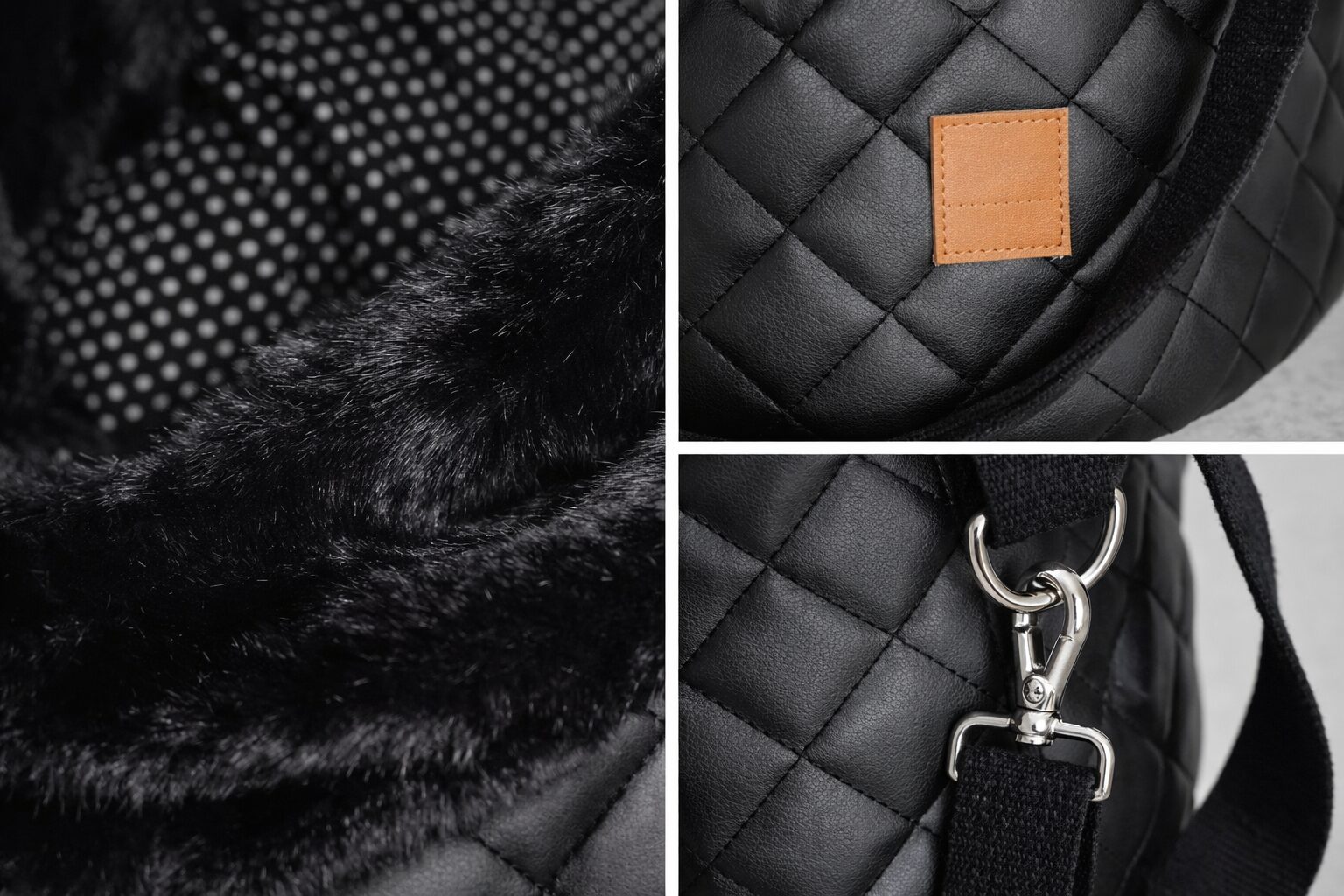 Diese Taschen haben einen festen Stand und bieten Ihrem Vierbeiner einen super bequemen und kuscheligen Platz. Das strapazierfähige Außenmaterial gibt der Tasche einen edlen Look. Im Inneren dick und flauschig gepolstert, mit einem super weichen herausnehmbaren und waschbarem Teddy Fell. Zusätzlich sorgt ein super flauschiges Kissen für Wohlbehagen. Ein kurzer Gurt mit Karabiner, zur Sicherung Ihres Vierbeiners, ist ebenfalls im Inneren angebracht.