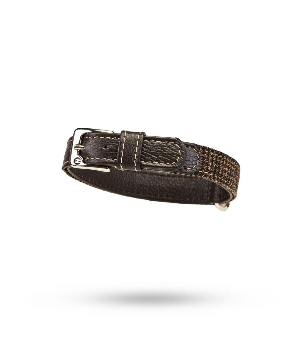 Die ultraleichte Aluminiumschnalle sowie Beschläge in Palladium-Optik runden das Gesamtbild edel ab. Der Stoff in warmen, dunkelbraunen Tönen harmoniert perfekt mit dem weichen, fein gearbeiteten Leder. Das erinnert mit seinem klassischen Hahnentrittmuster an die zeitlose Eleganz der 1960er-Jahre – schlicht, geschmackvoll aber auch modern interpretiert.