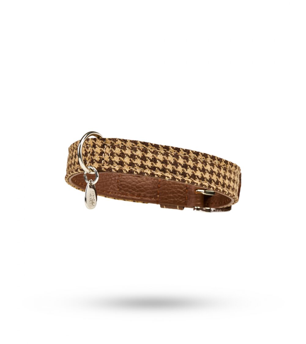 Das MALUCCHI Geschirr Movie Winter ’60, gefertigt aus einem hochwertigen Woll-Baumwoll-Mischgewebe mit elegantem Haselnuss-Pied-de-Poule-Muster, verbindet dieses Accessoire stilvolle Optik mit edlen Materialien. Der gefütterte wie auch verstellbare Bauchbereich aus besonders weichem italienischem Kalbsnappaleder sorgt dabei für hohen Tragekomfort. Kontrastierende ecrufarbene Ziernähte verleihen dem Design eine feine handwerkliche Note.