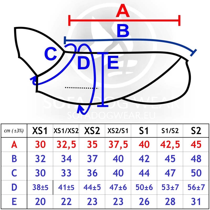 Das „A“ entspricht der Rückenlänge des Hundes! Diese wird von den Schultern bis zum Punkt vor dem Rutenansatz gemessen. Messen sie NICHT den Hals, oder die Rute, oder die Oberchenkel mit! „B“ und „C“ (BLAU) entsprechen und zeigen die tatsächlichen Maße des Mantels/Produkts (nicht denen des Hundes!!)